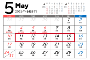 2025年5月GW代休のお知らせ。5月12日(月)~5月16日(金)までゴールデンウイークの代休をいただきます。ご迷惑をおかけいたしますがご了承くださいますようお願い申し上げます。5月17日(土)より 通常営業いたします。